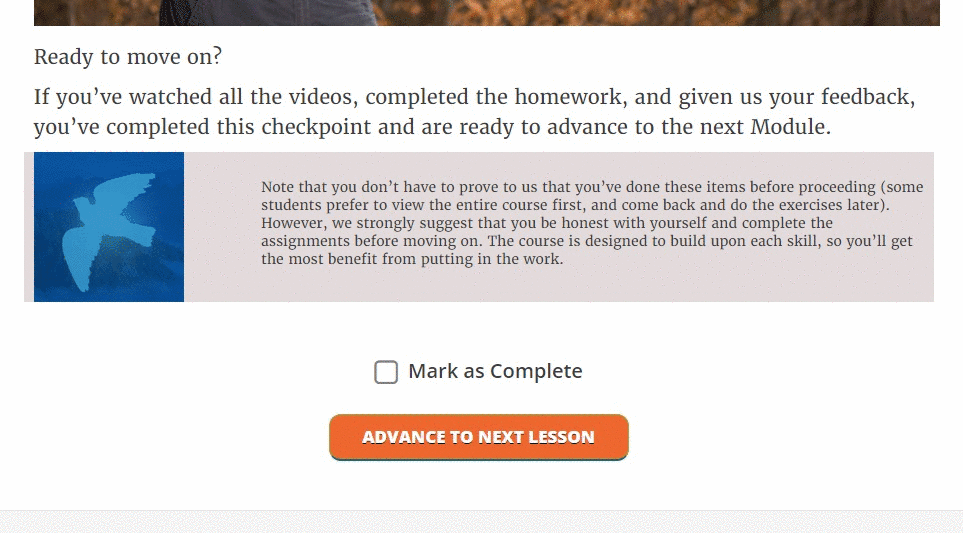 Here’s our bold experiment to get you better results: If you don’t keep up with the course, you will lose access.