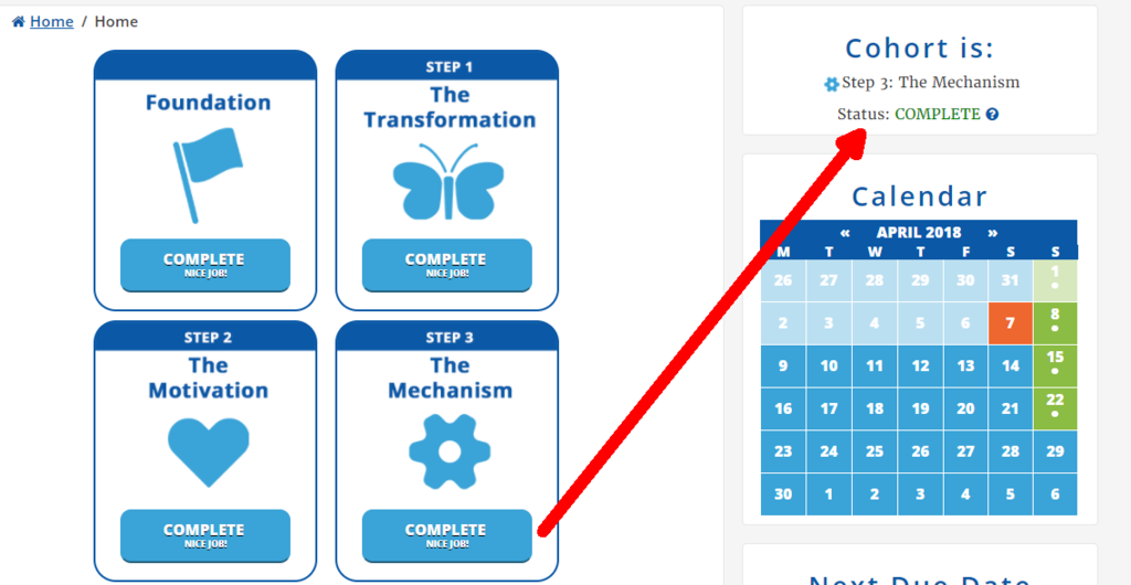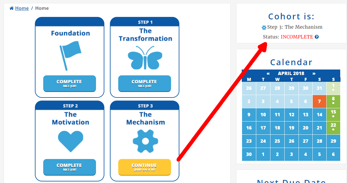In this screenshot, the cohort is in Step 3. This user has not completed this module. The Step 3 module’s button is yellow, the status says ‘Incomplete’, and they are not caught up with the cohort and must keep up by the deadline.